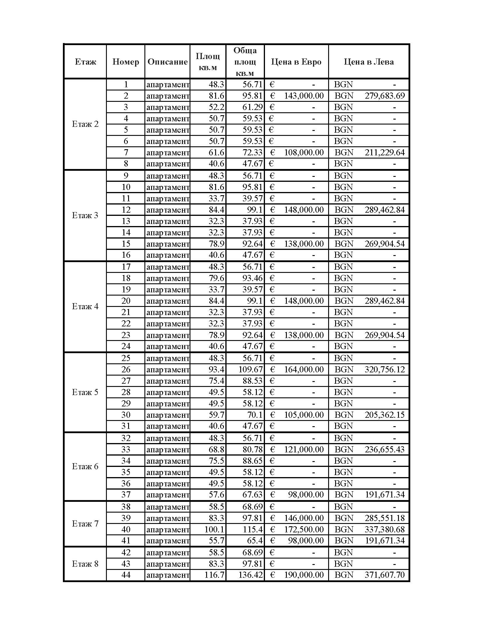 | 8 | 44 | Апартамент | Двустаен | 1 | 117кв.м | 19кв.м | 136кв.м | 231500.00€ | 1702.21€ |