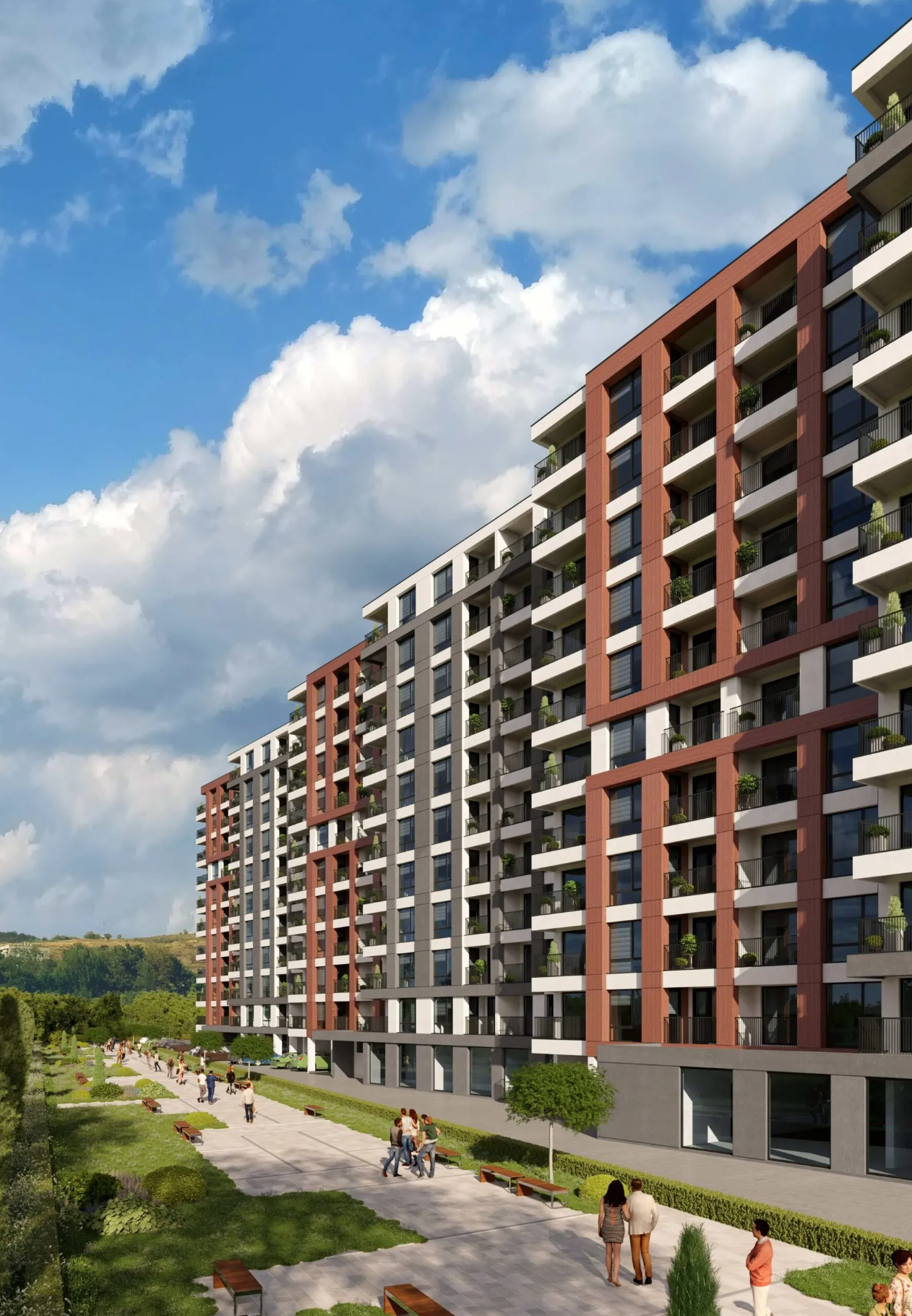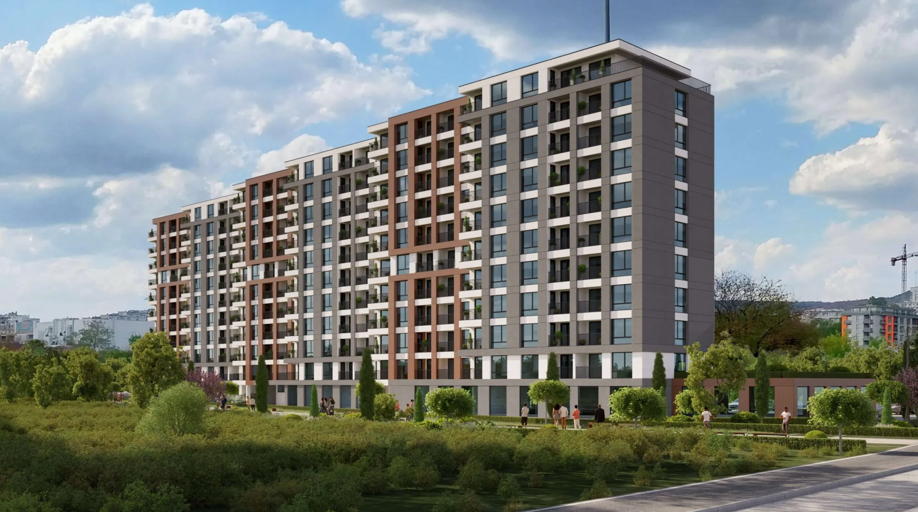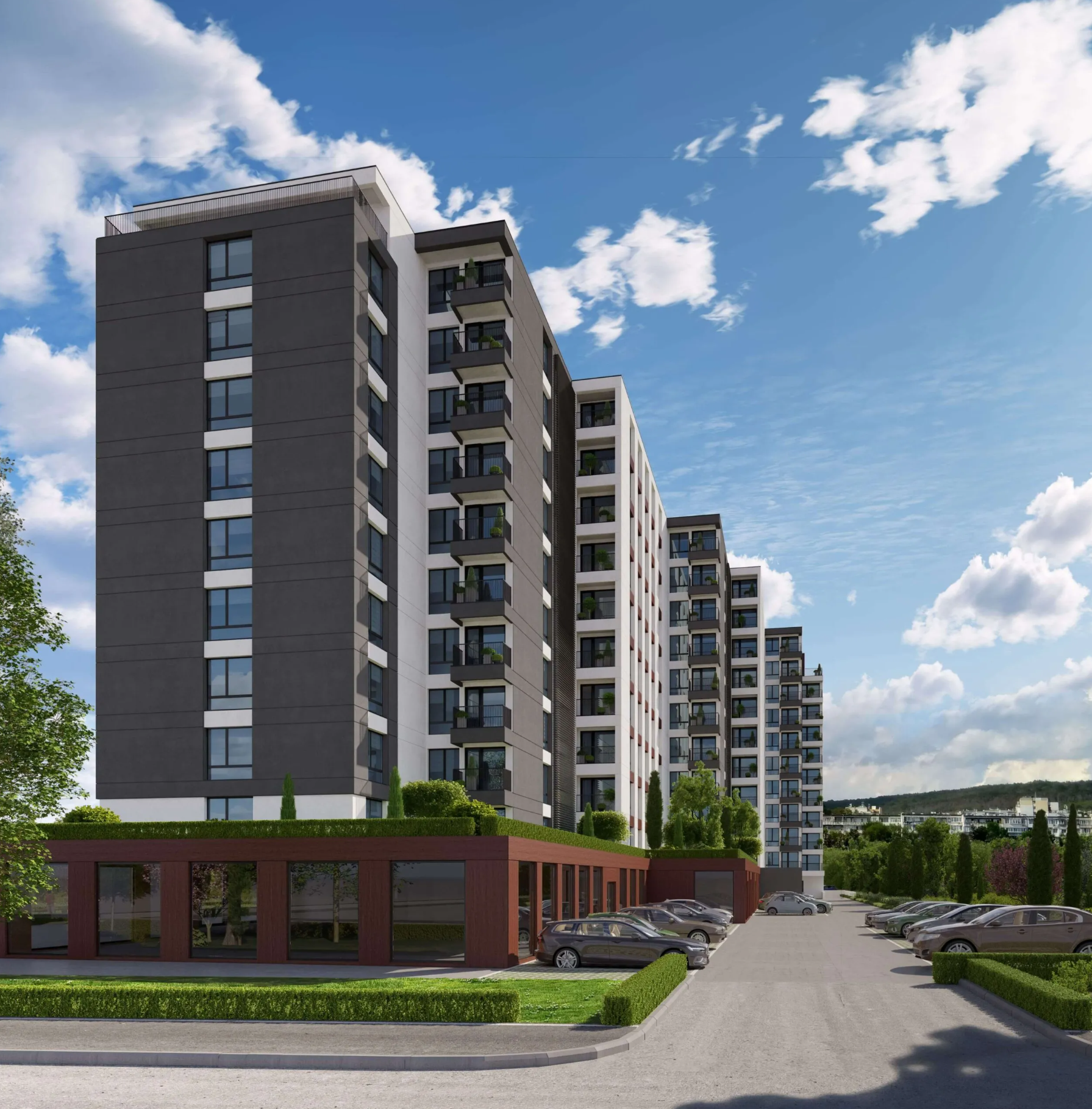 Проектът съчетава модерна архитектура и естествени елементи. Фасадата е с акцент върху топли цветови решения и стилни линии, създавайки отличителна визия и уют.