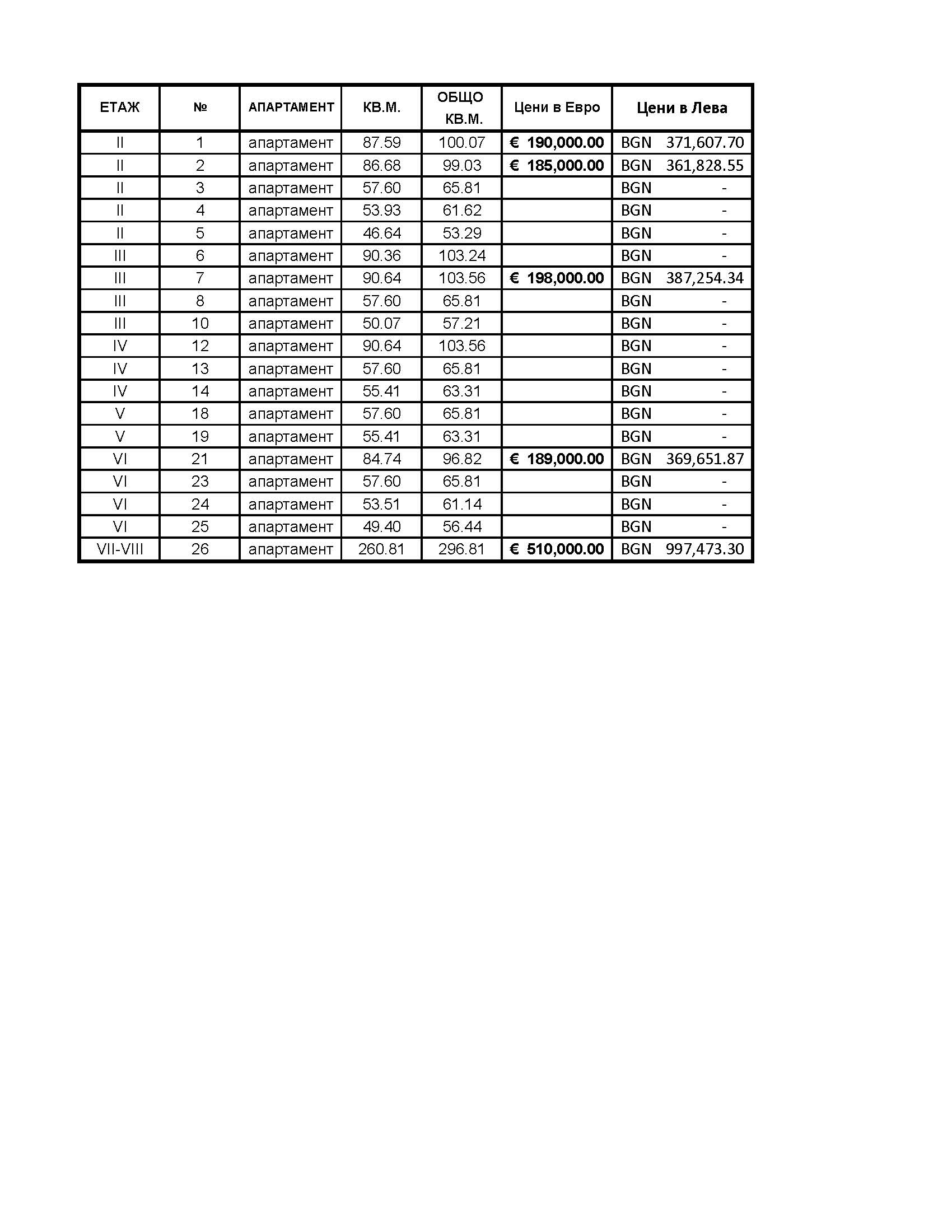 | 7 | 26 | Апартамент | Четиристаен | 2 | 260кв.м | 36кв.м | 296кв.м | 510000.00€ | 1722.97€ |