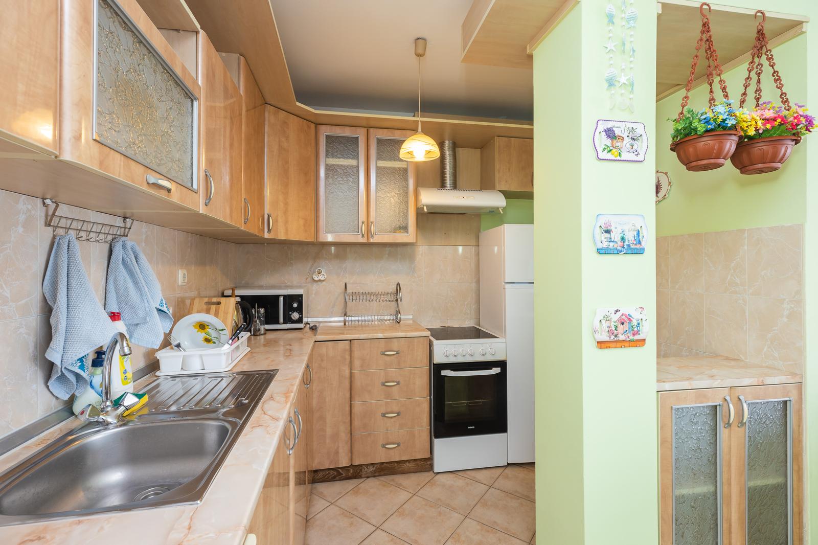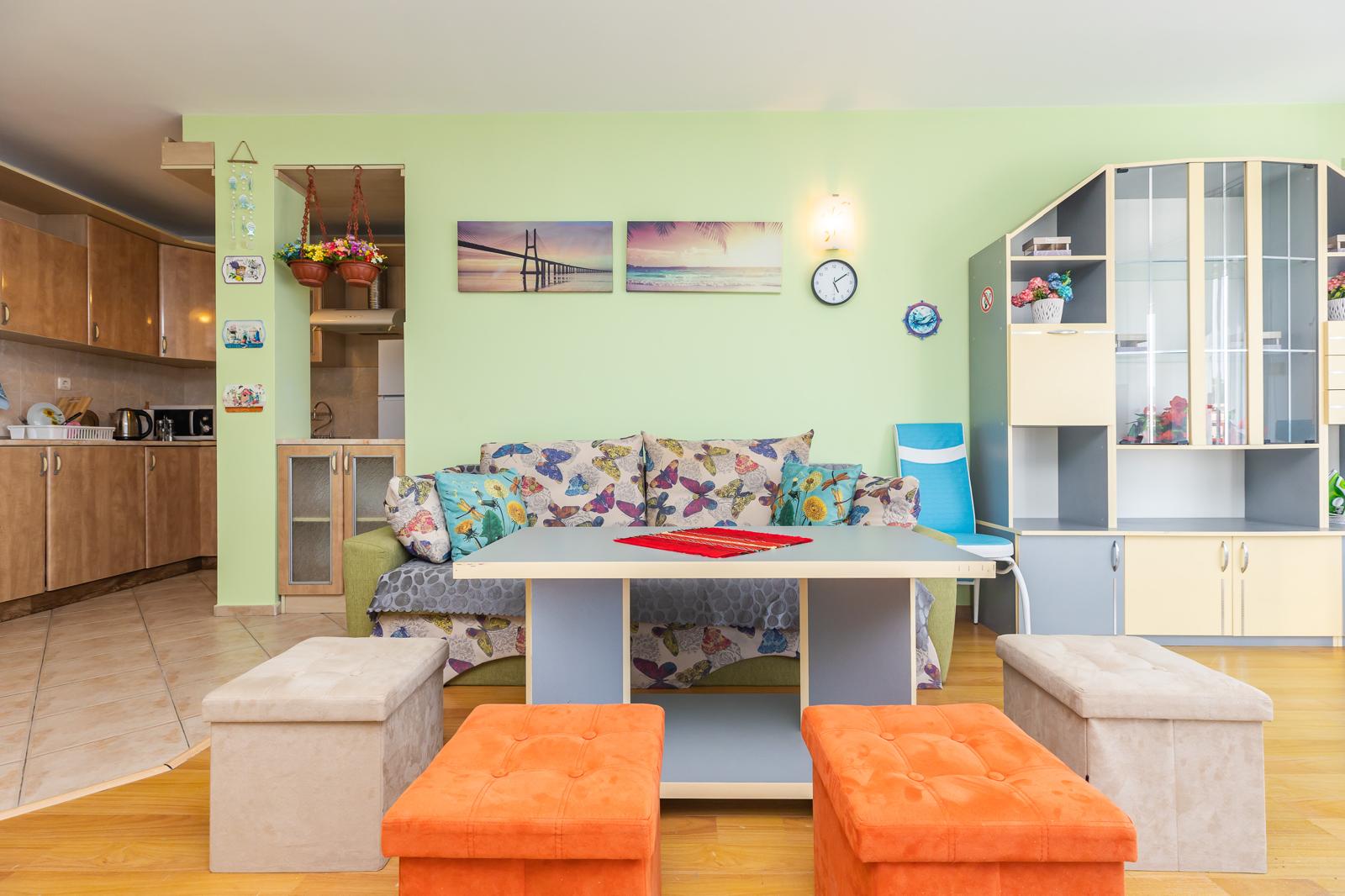 Разположен в самото сърцето на Варна, в сграда с асансьор. Състои се от просторна дневна с излаз към балкон, три спални, две санитарни помещения. Дневната е около 30 кв.м. с обособени кухня, трапезария и хол. Кухнята е оборудвана с всички необходими за едно домакинство уреди. Отоплението и охлаждането е с климатици. На пешеходно разстояние е от ”Морска градина”, банки, административни сгради. В близост до спирки на градски транспорт. Подходящ за студенти, семейство с деца.