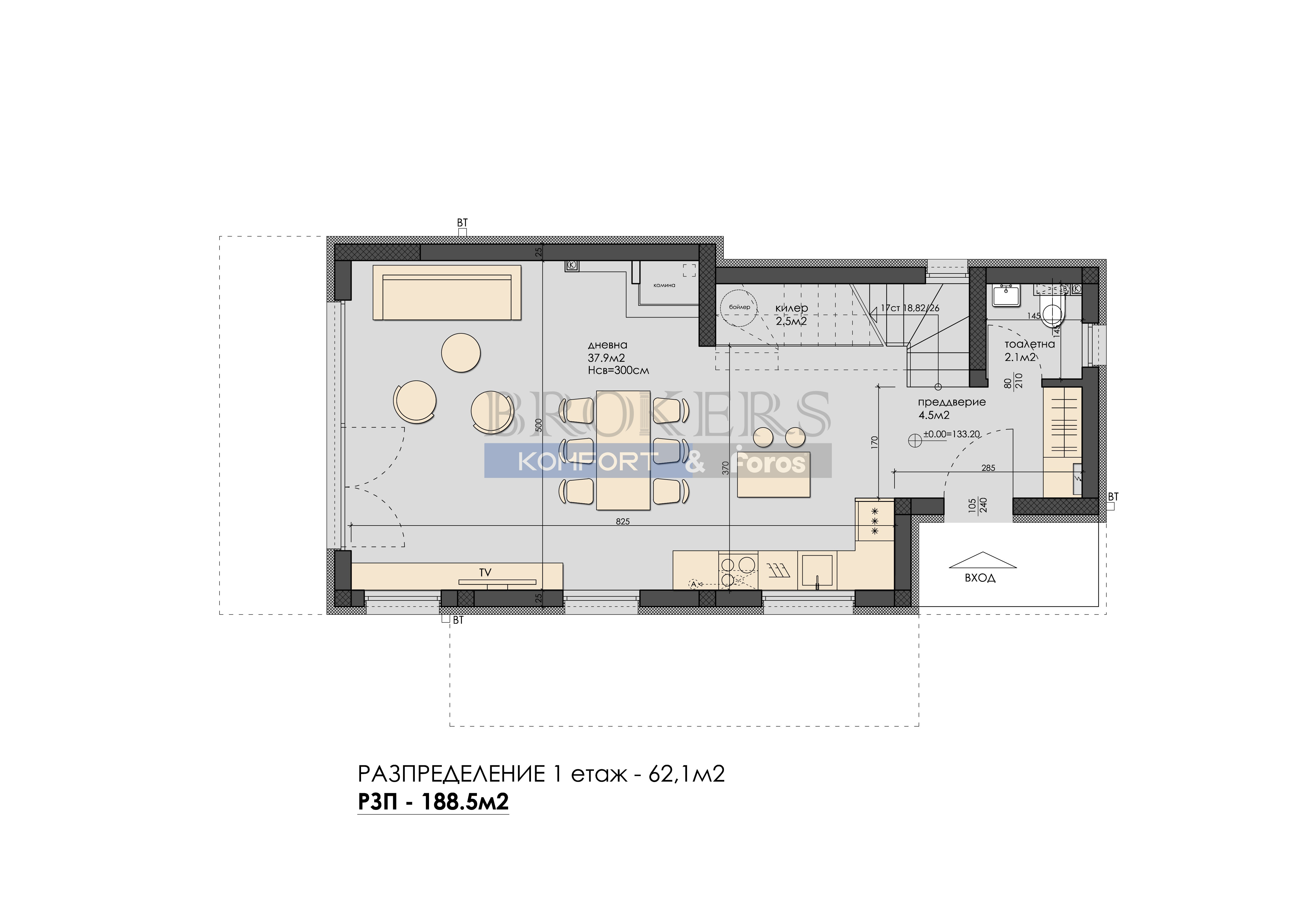 Ет. 1 на площ от 62,10 кв.м са разпределени предверие; санитарен възел, килер, дневна с кухненска част, холова част с излаз на веранда;
