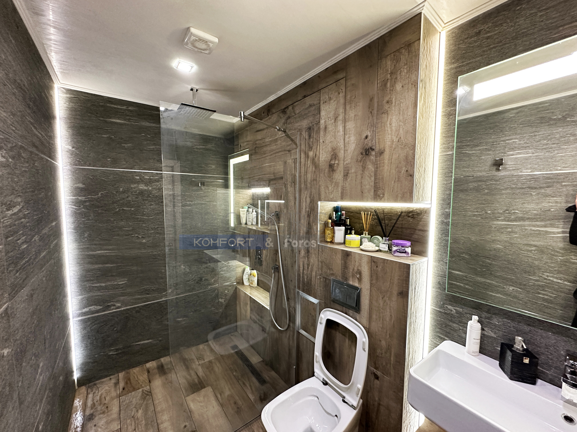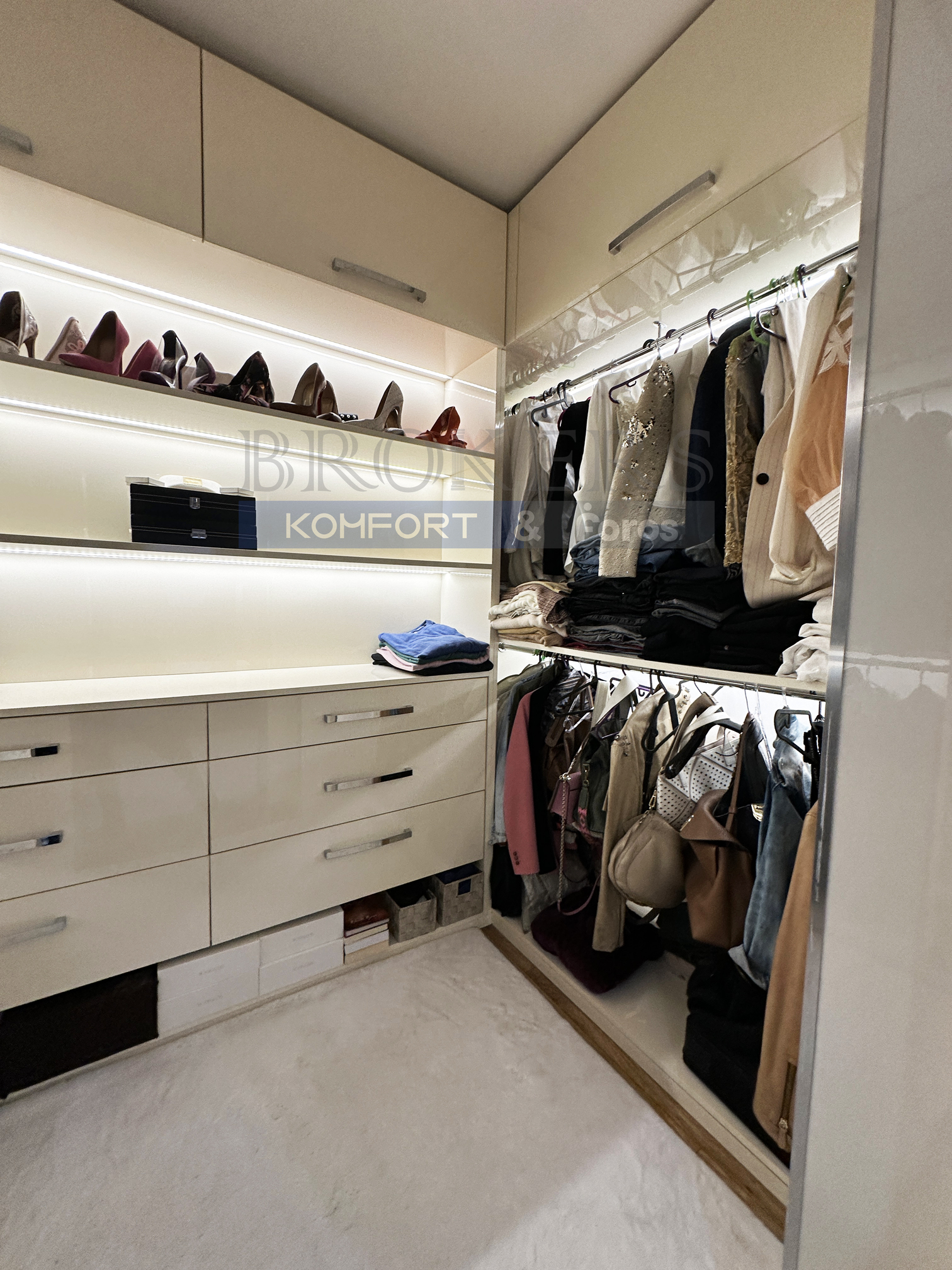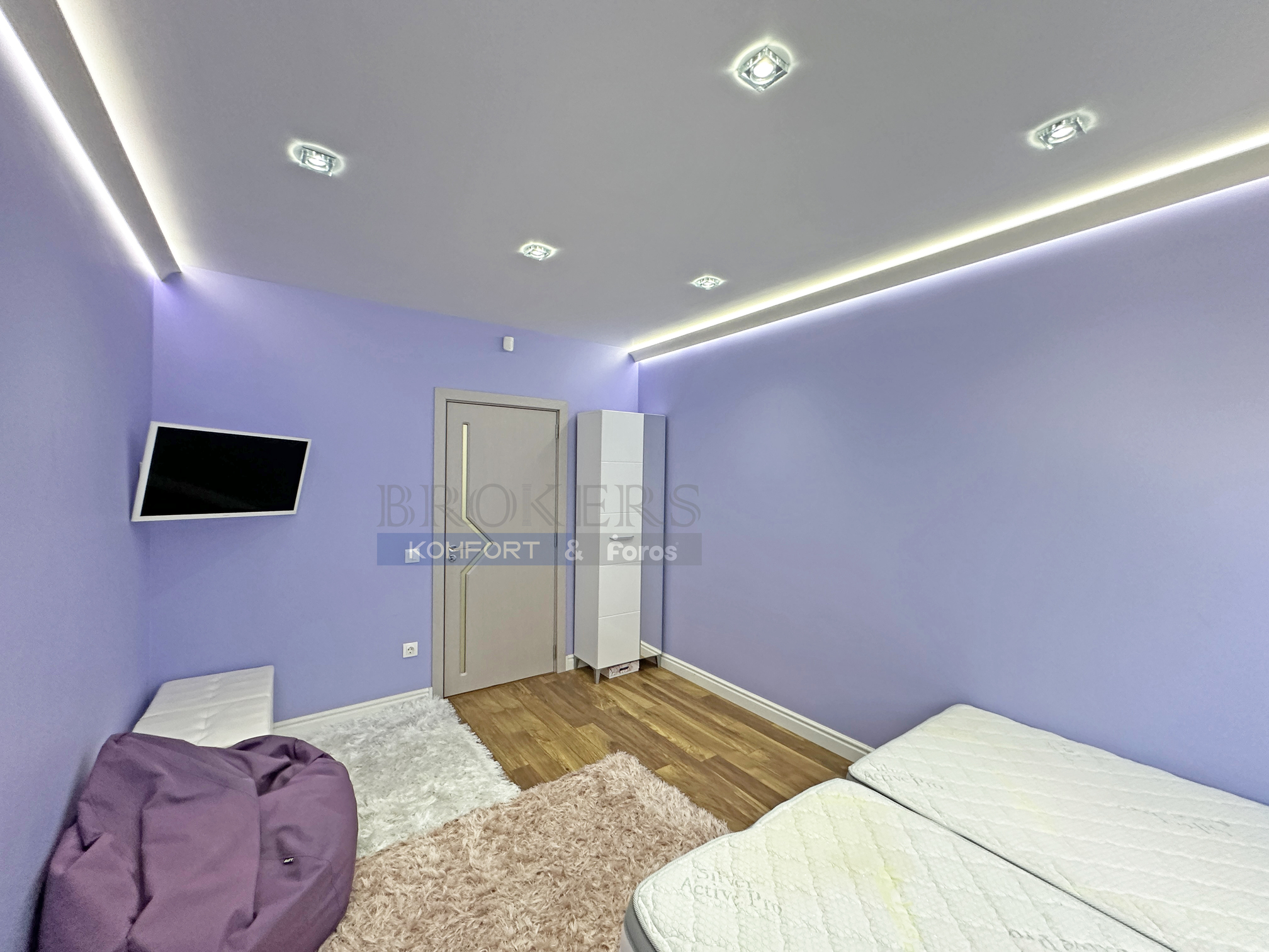 Едната баня с тоалетна в момента е обособена като дрешник, достъпът до който е от родителската спалня – 18 кв.м., посредством елегантни плъзгащи врати и е с площ от 6 кв. м. Детската стая е с площ от 16 кв.м.