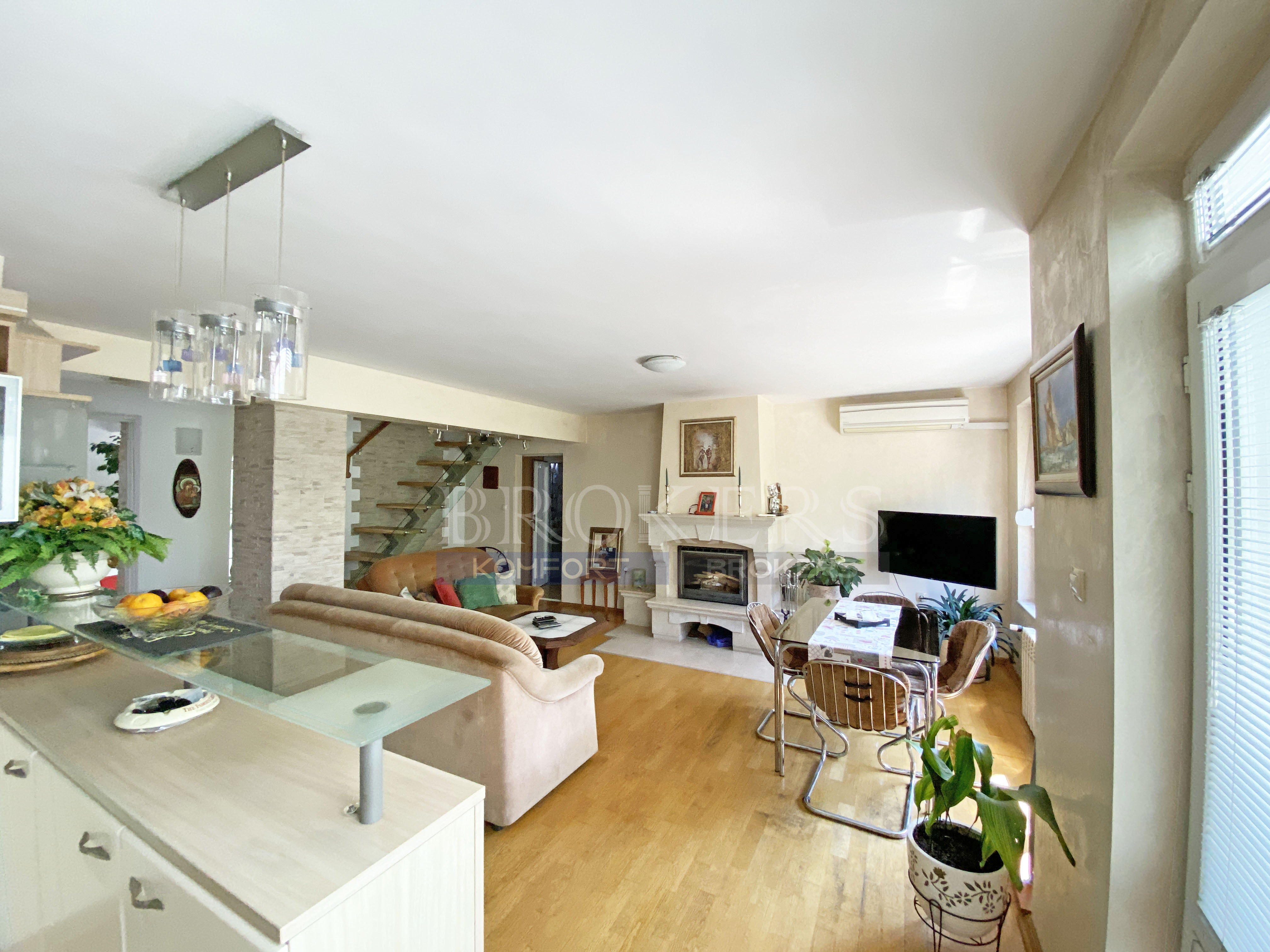 Апартаментът разполага с камина с водна риза, радиатори и въздуховоди, отоплителната система работи и чрез котелно на ток.