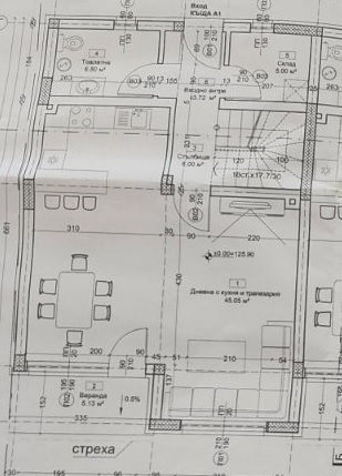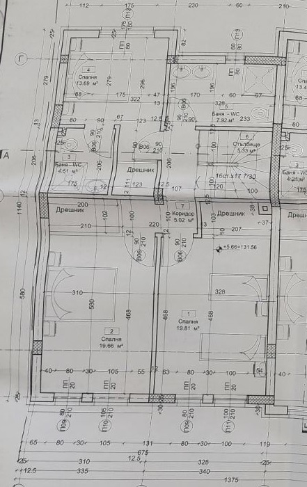 Имотът се състои от: всекидневна, санитарно помещение- 5 кв.м, баня + тоалетна, антре- кв.м и 5 спални.