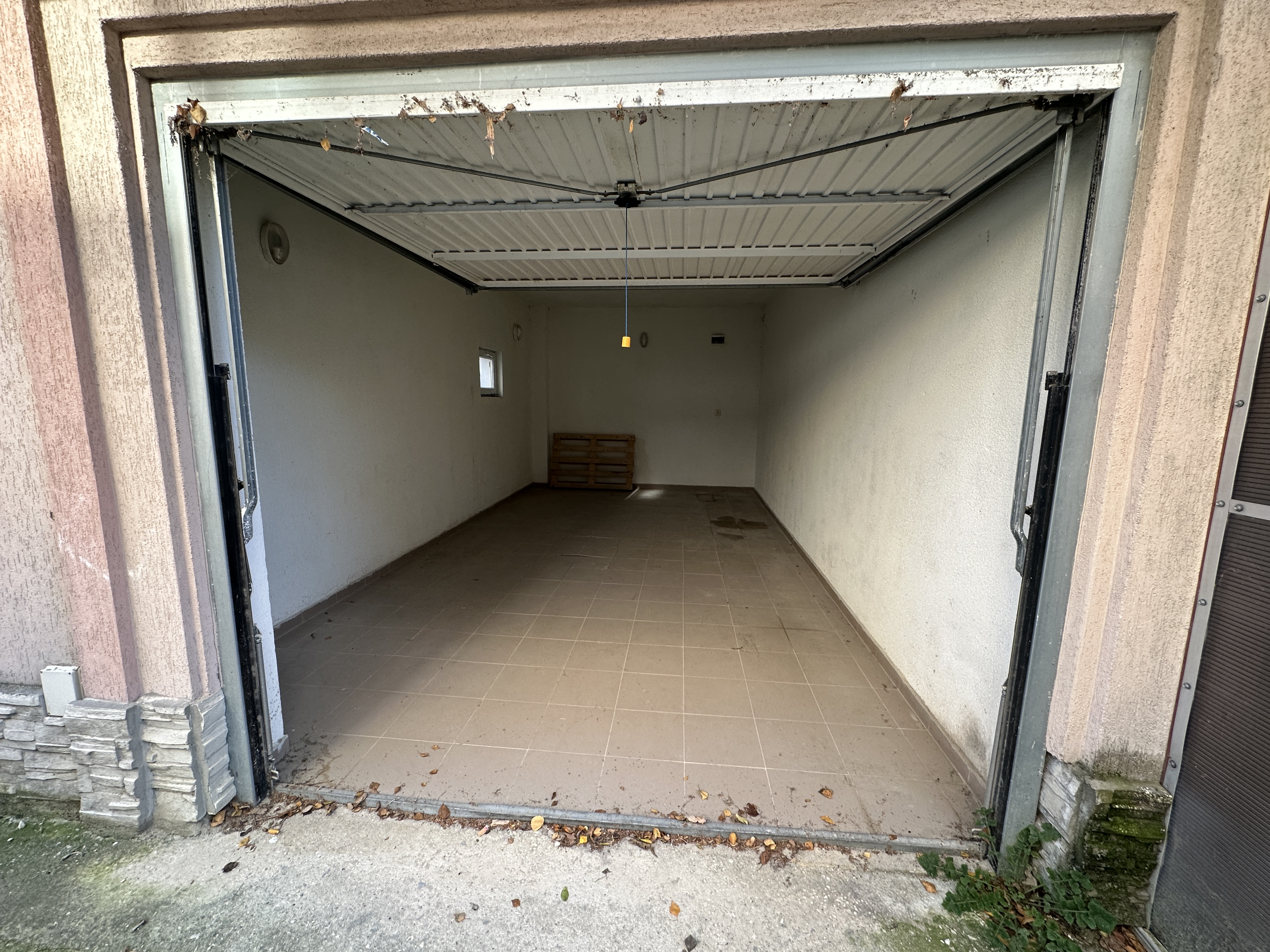 Широчината на гаража е 3,50 метра. Има партида за ток, което го прави подходяшщ за зареждане на електромобил.