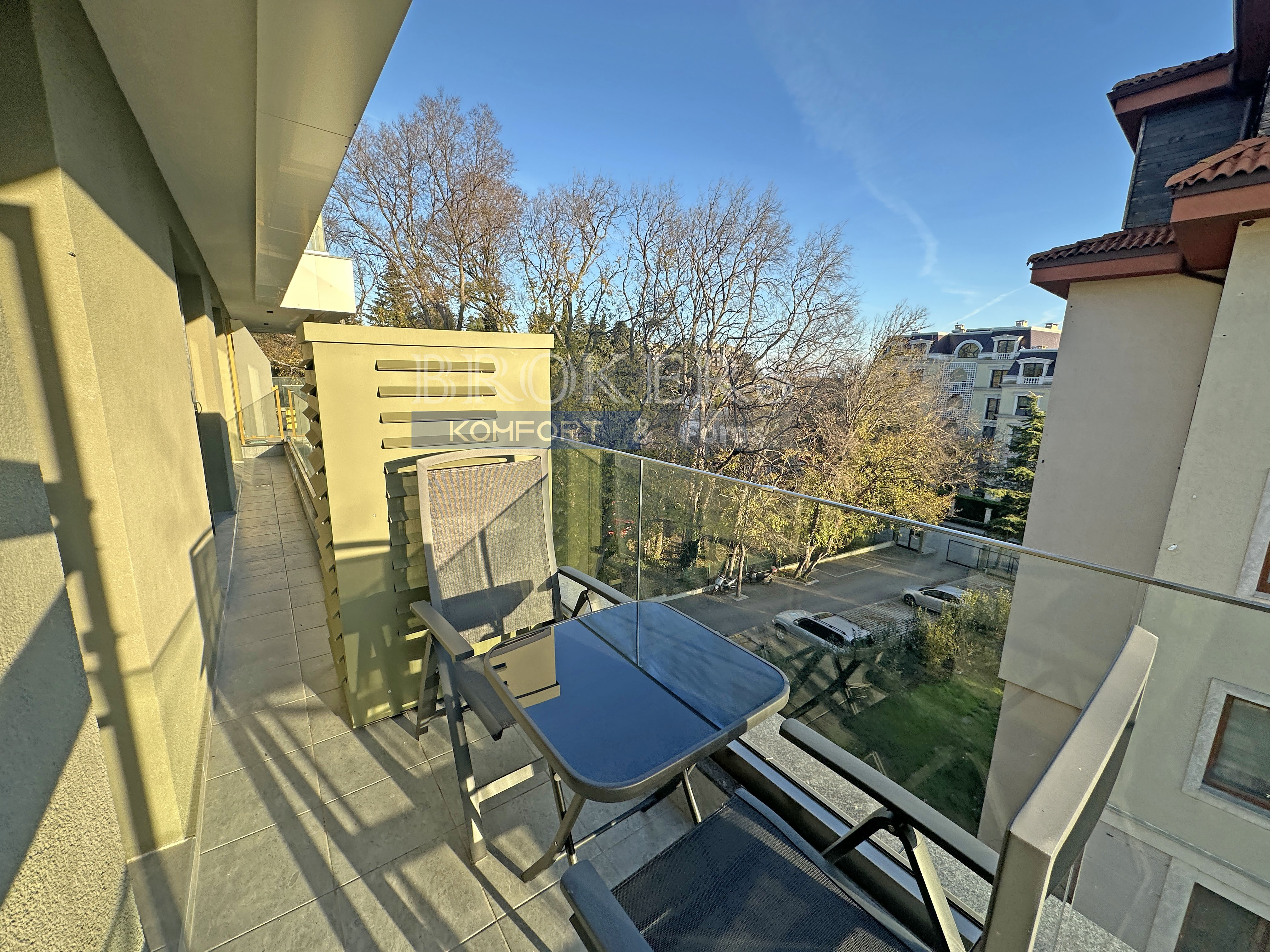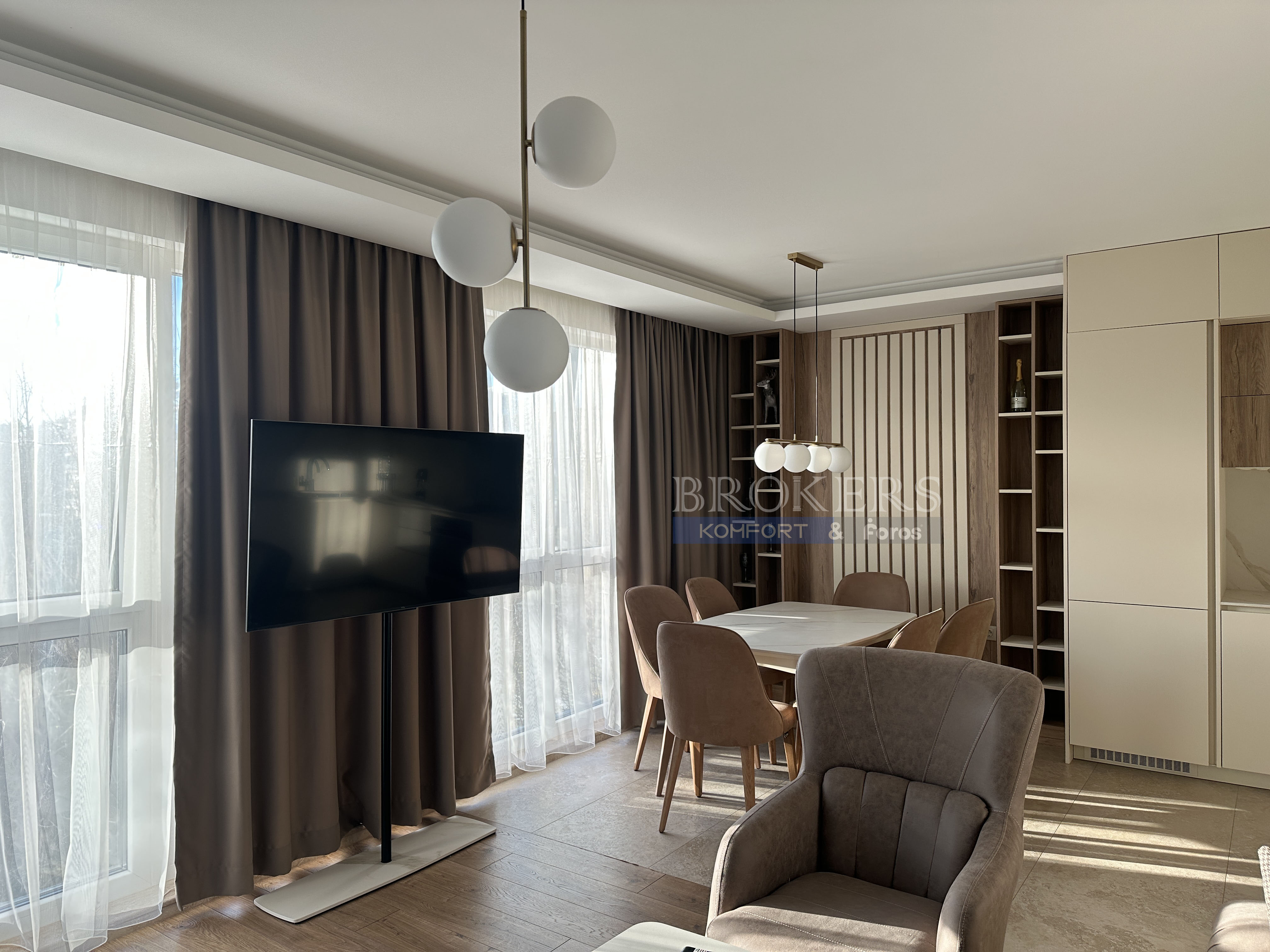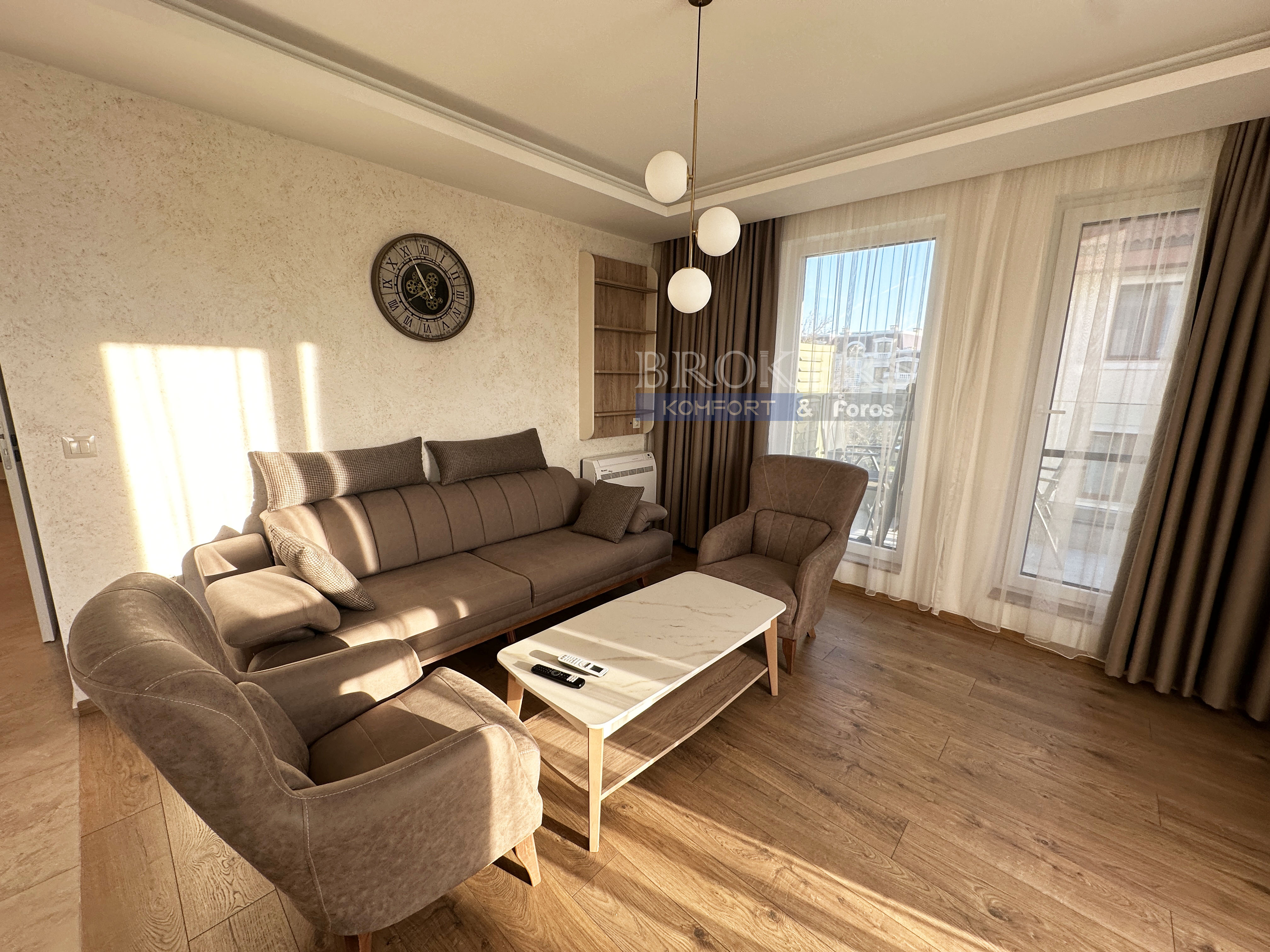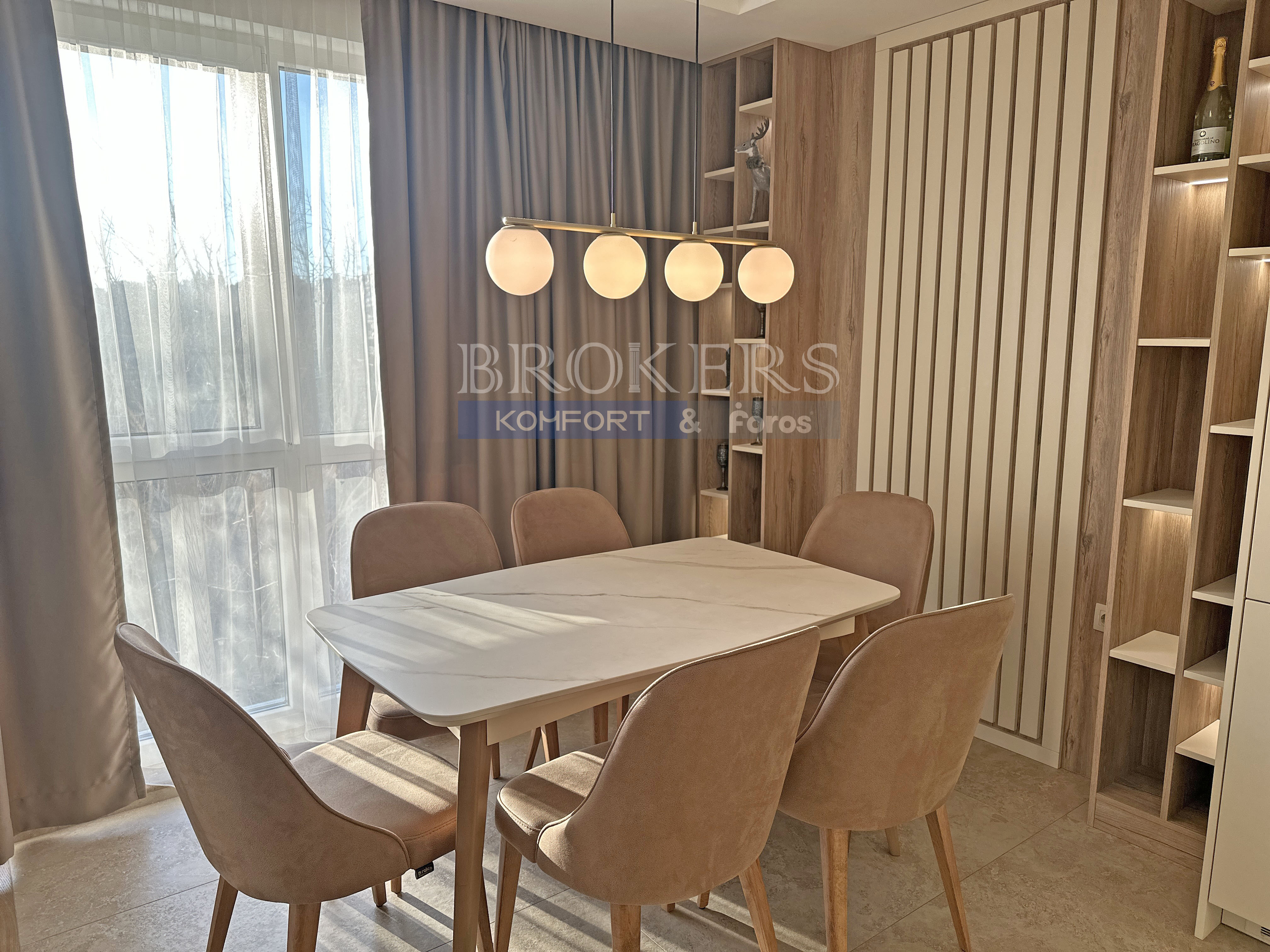 Жилището е разположено на 3-ти етаж (среден), с изцяло южно изложение, светло и топло, обзаведено с висок клас мебели и оборудване.