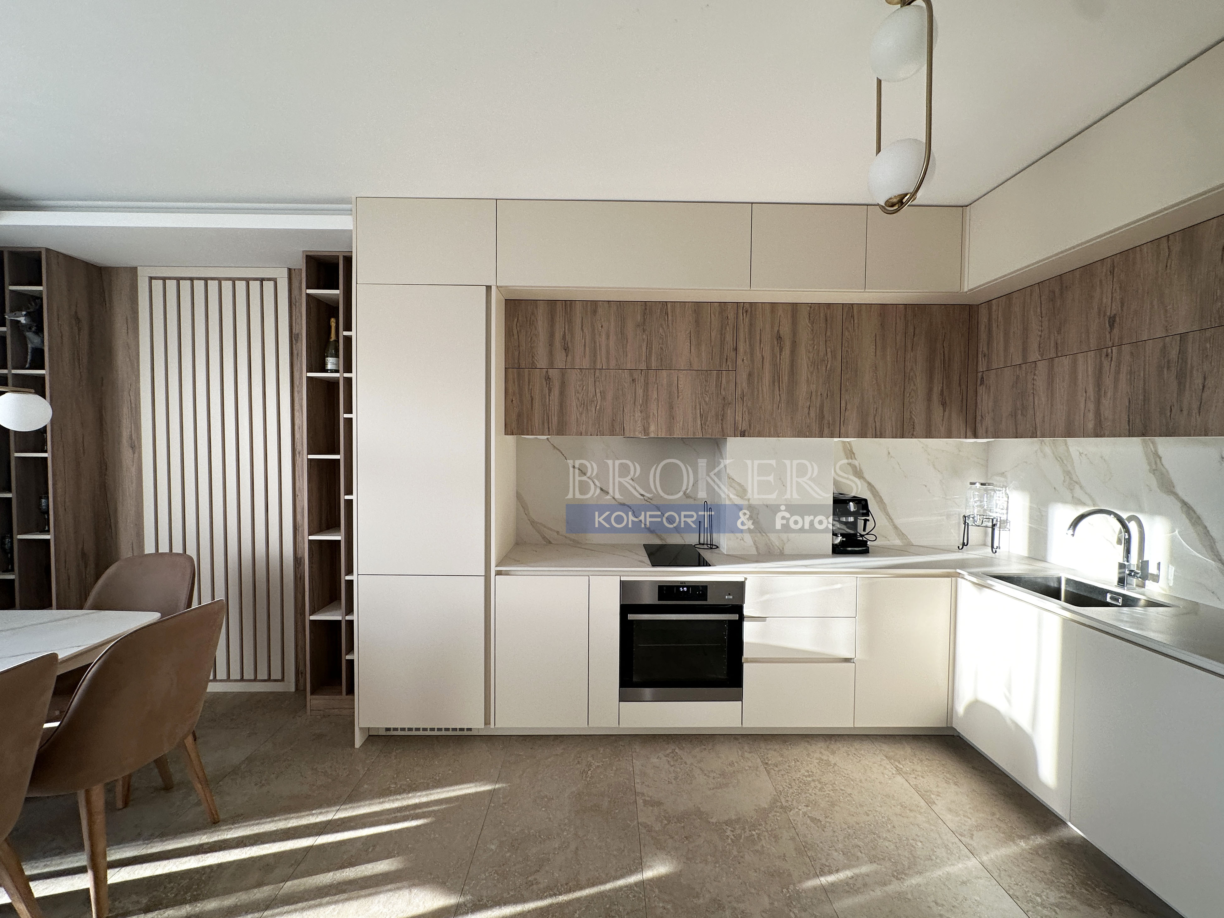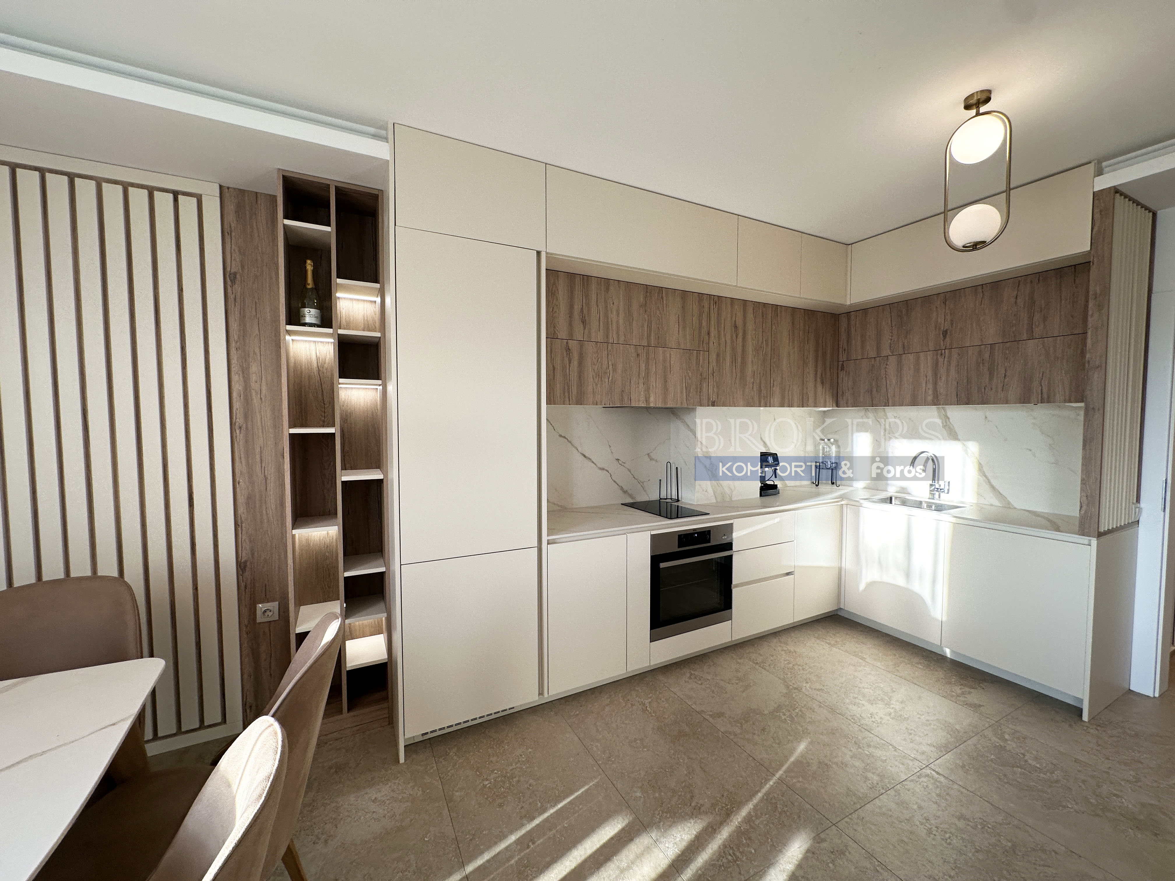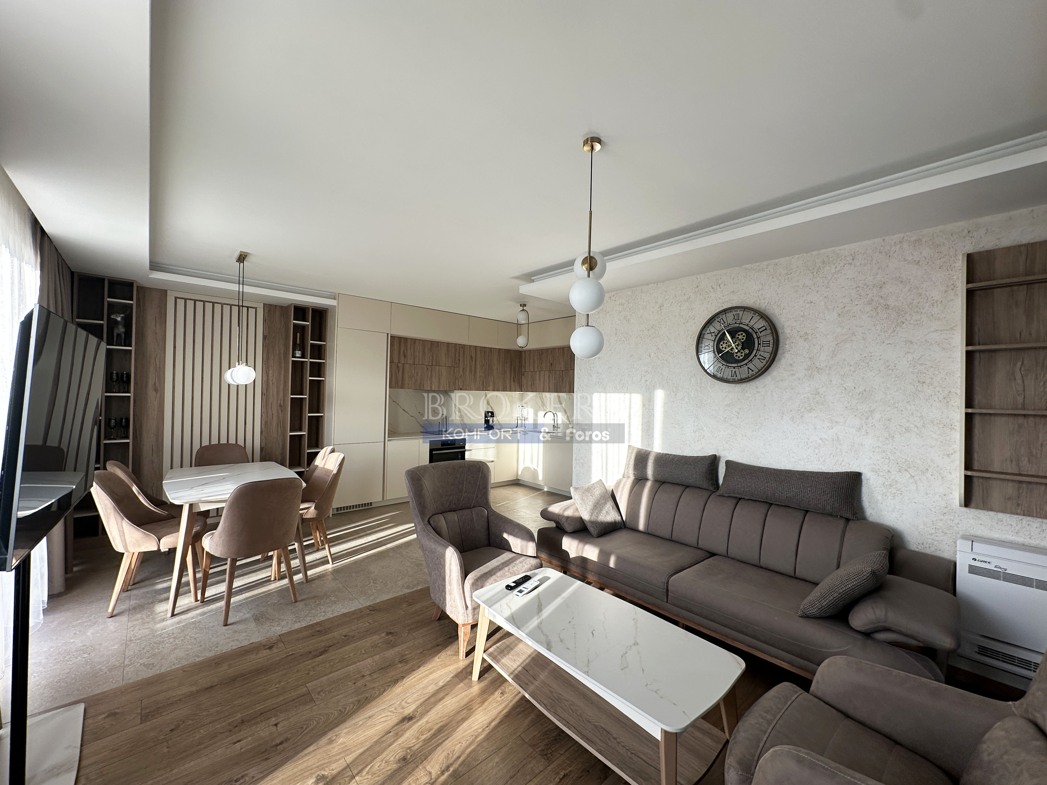 Жилището е разположено на 3-ти етаж (среден), с изцяло южно изложение, светло и топло, обзаведено с висок клас мебели и оборудване.