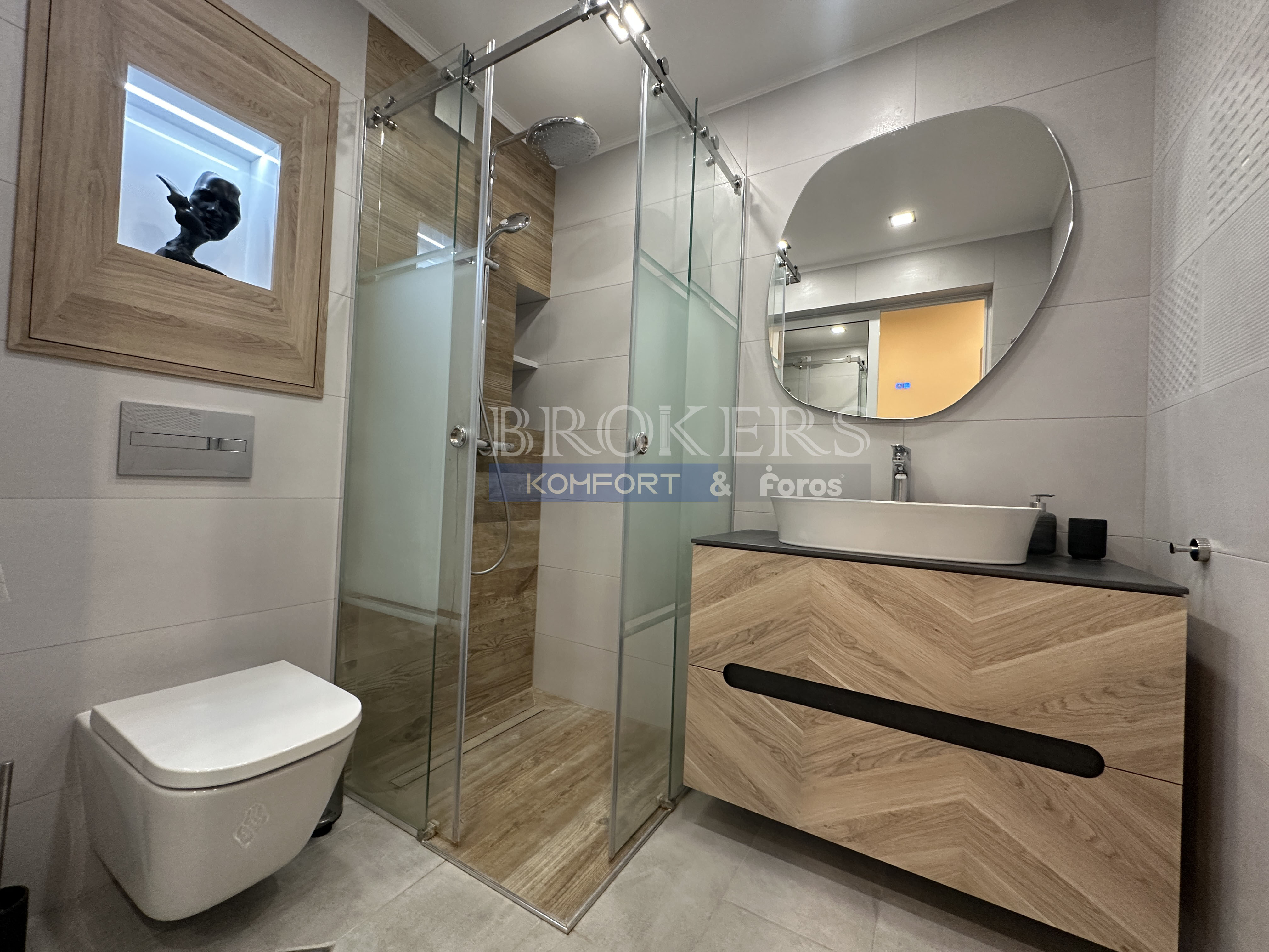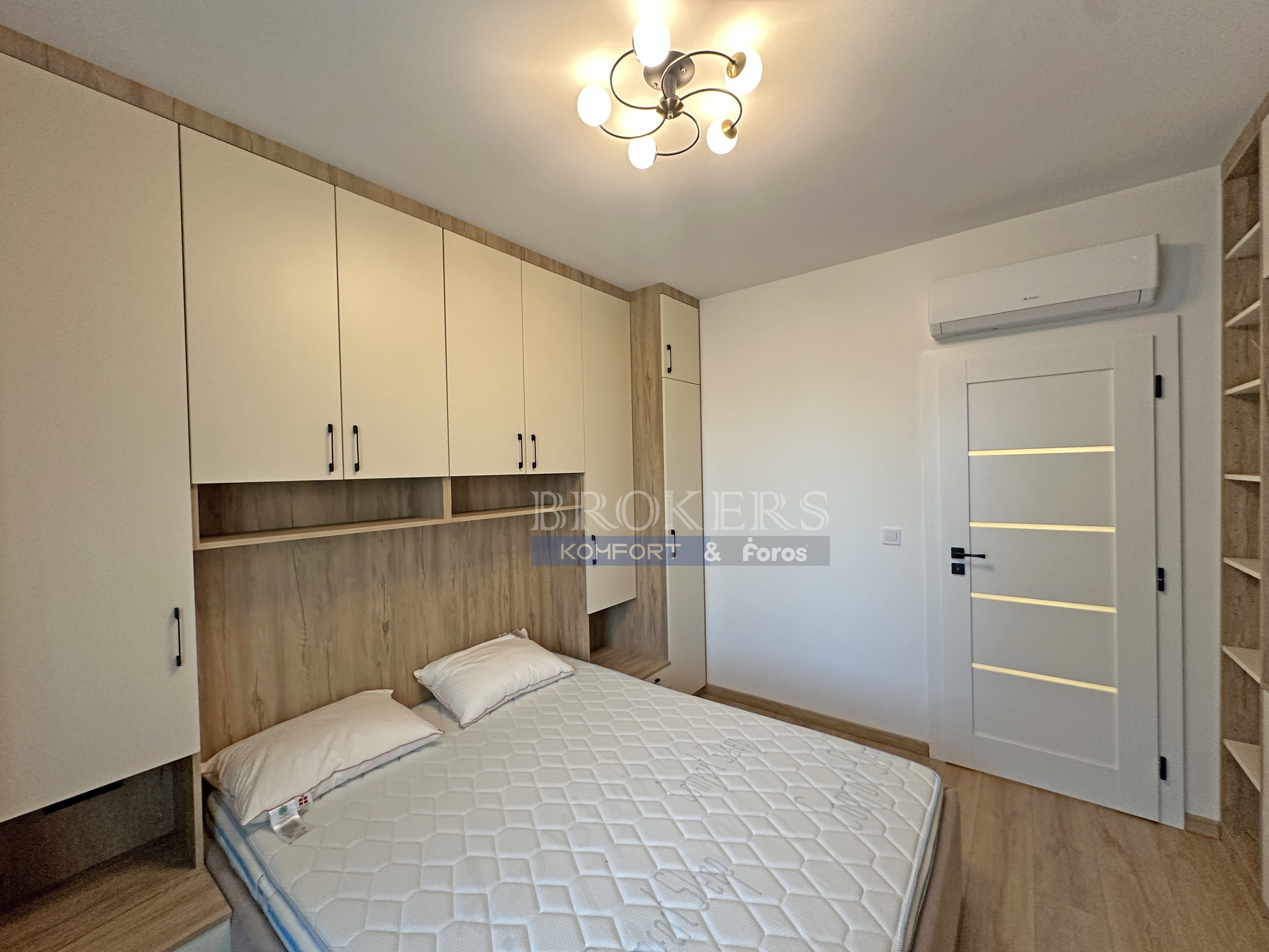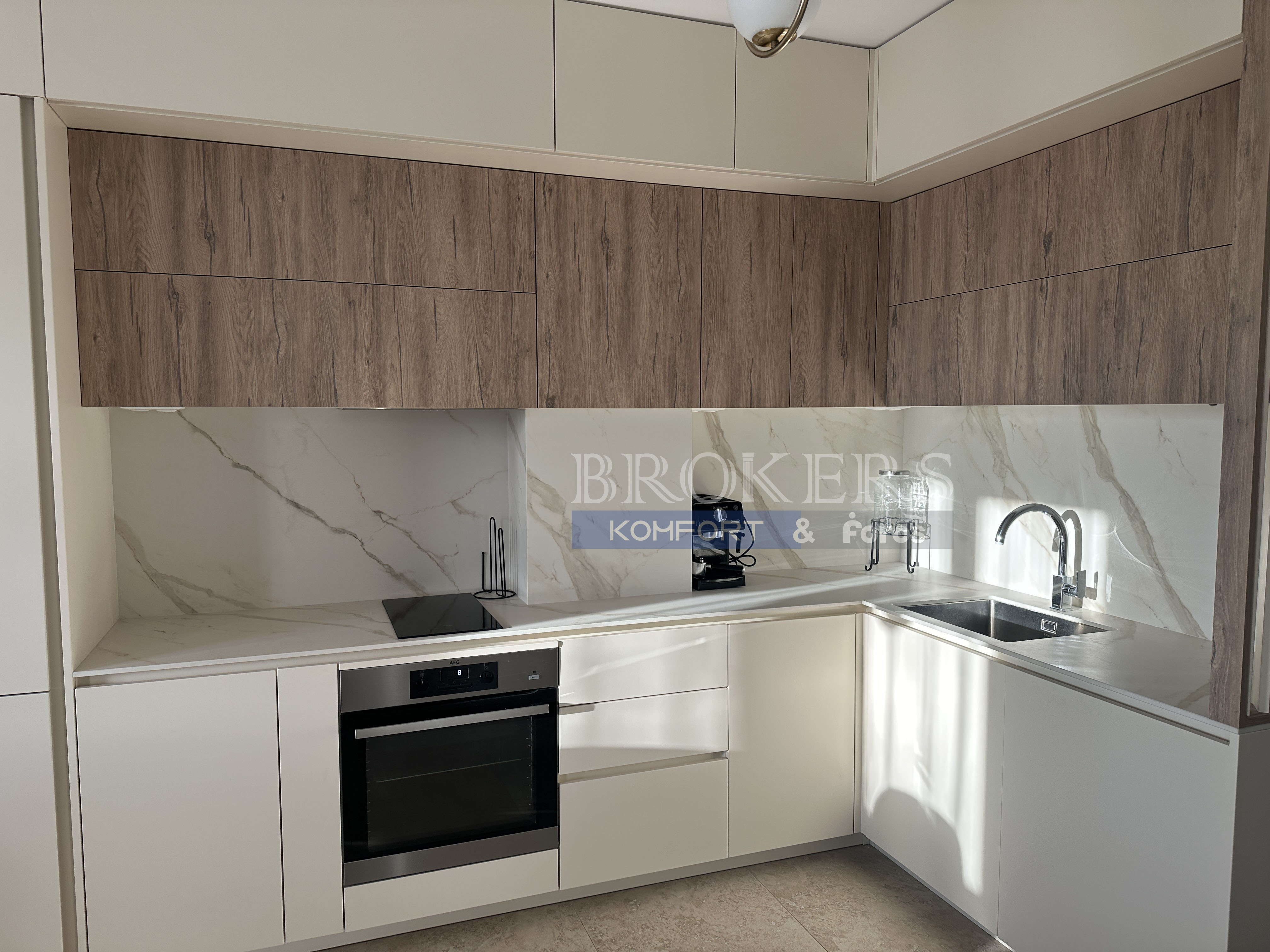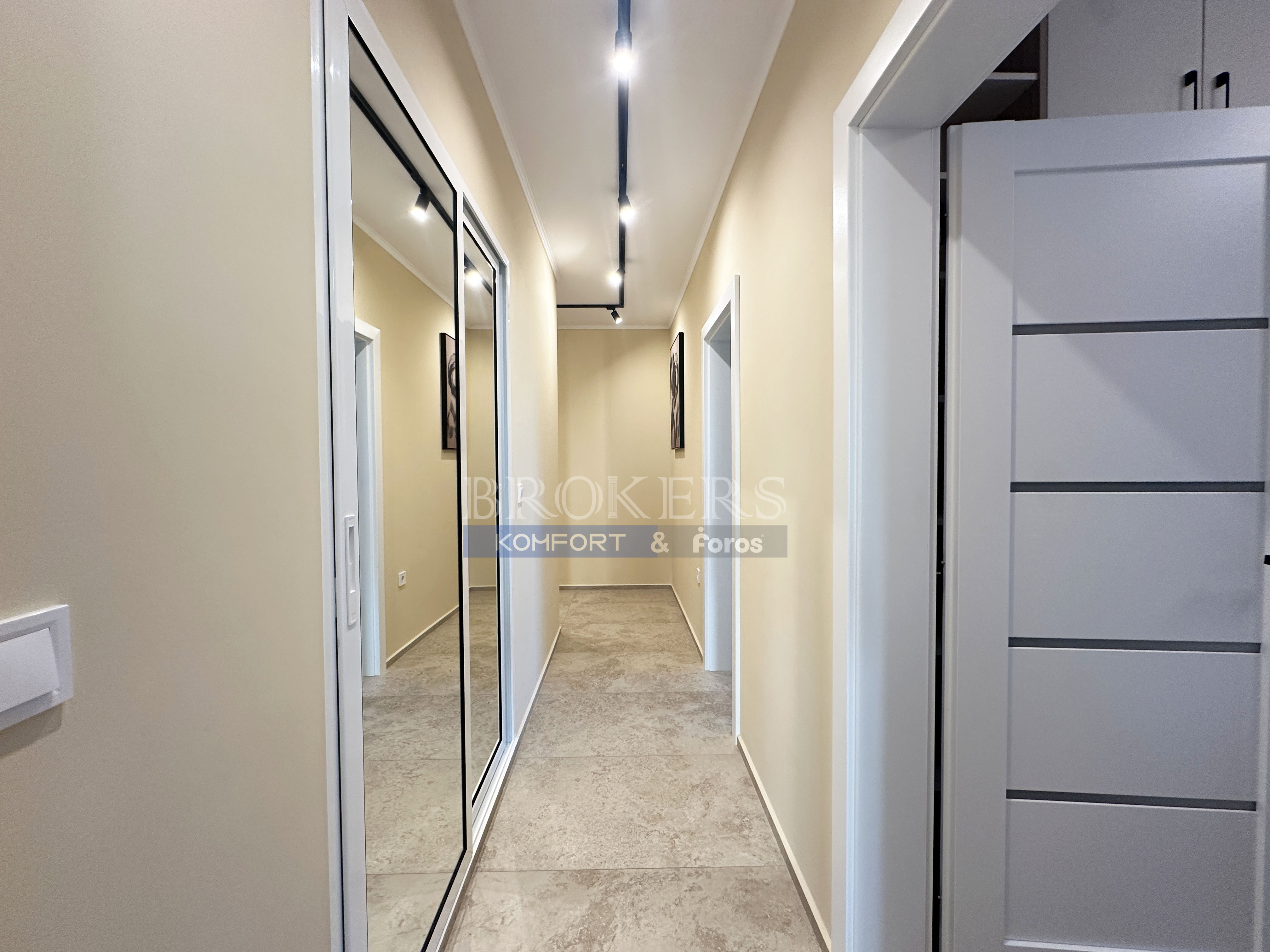 Жилището е разположено на 3-ти етаж (среден), с изцяло южно изложение, светло и топло, обзаведено с висок клас мебели и оборудване.