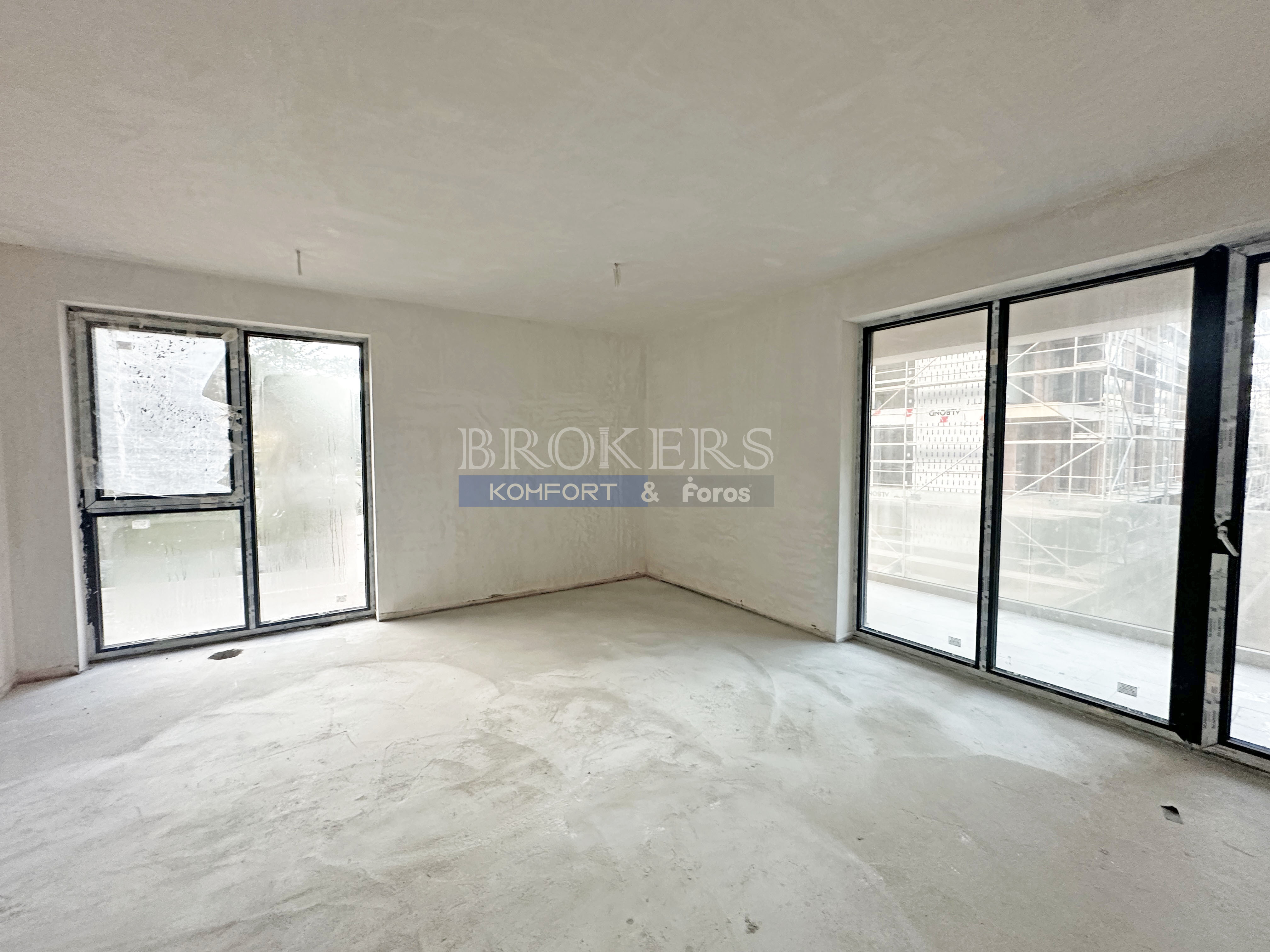 Апартаментът е с обща площ 112,45 кв.м. Разпределението включва просторна дневна с кухненска зона и трапезария, две спални, баня, отделна тоалетна, коридор и тераса, осигуряваща естествена светлина и приятна връзка с външната среда.