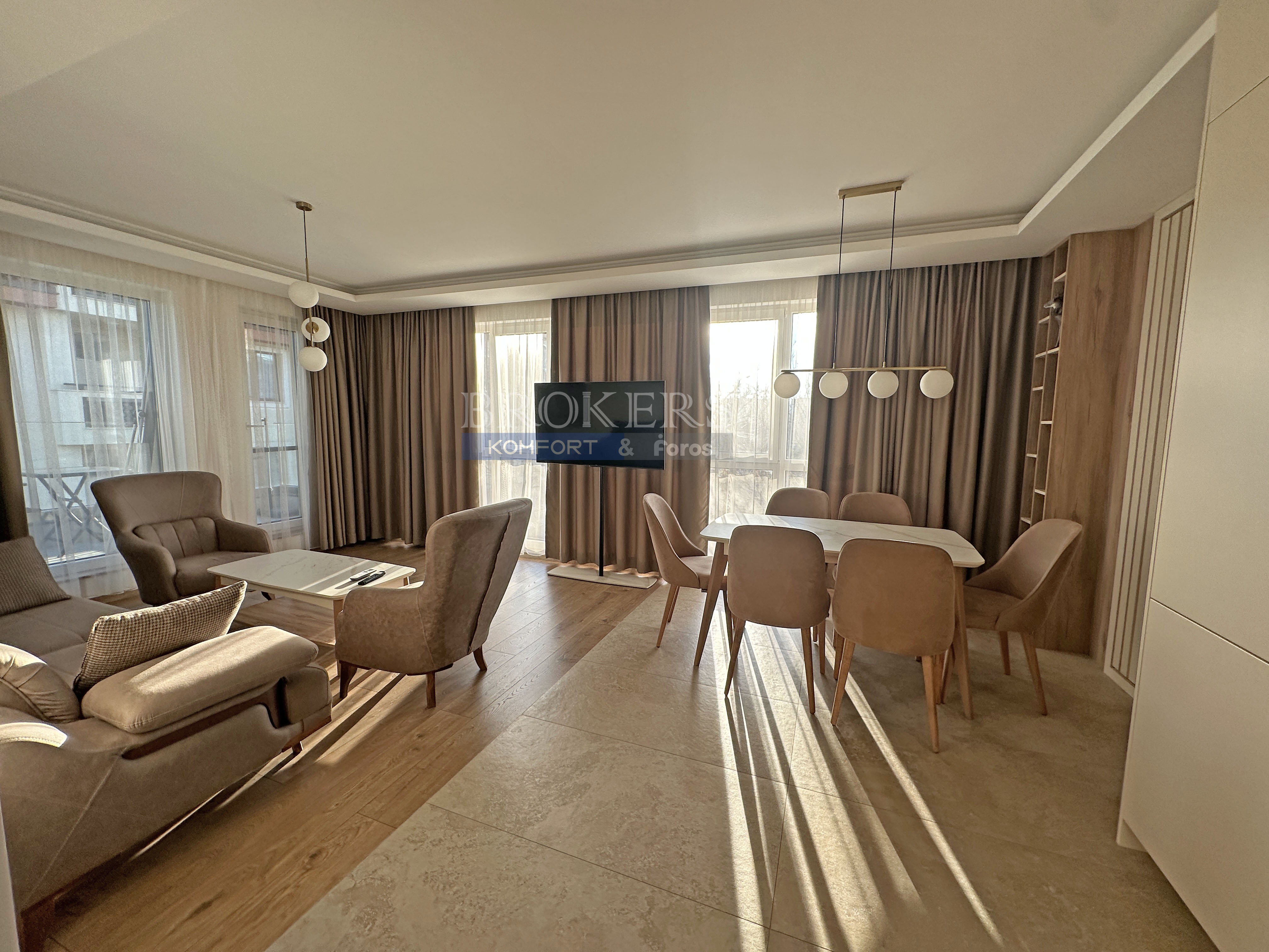 Жилището е разположено на 3-ти етаж (среден), с изцяло южно изложение, светло и топло, обзаведено с висок клас мебели и оборудване.