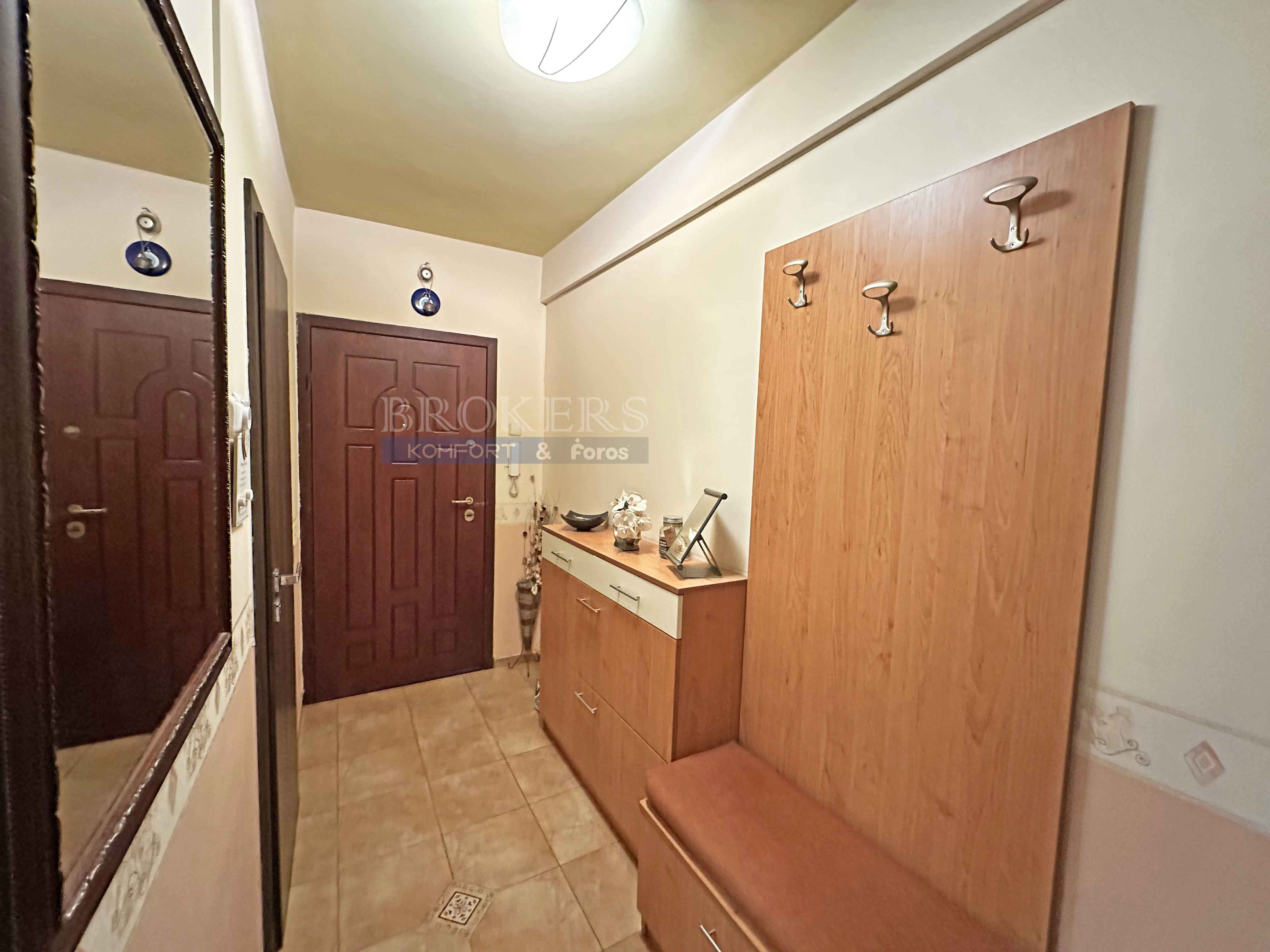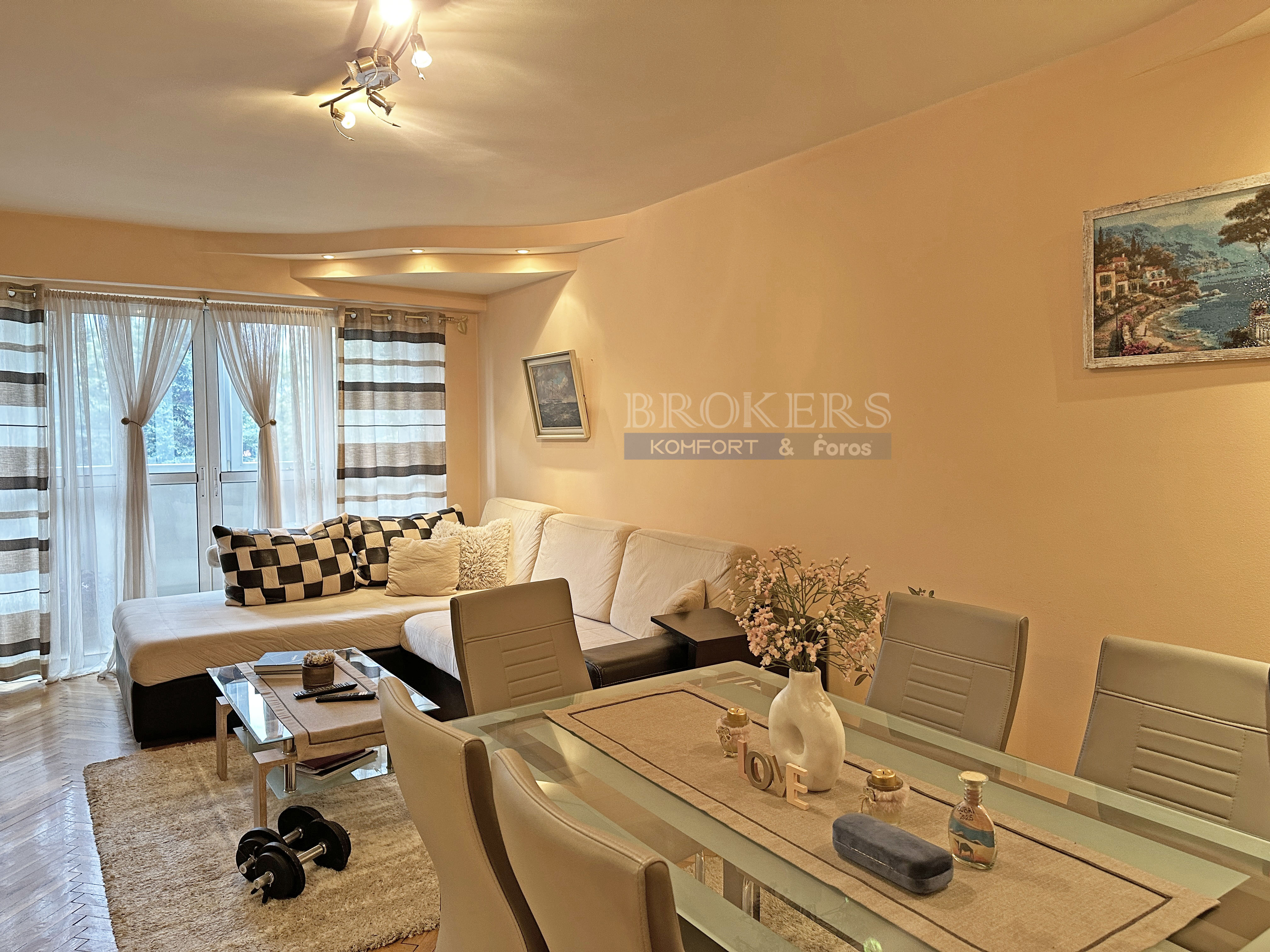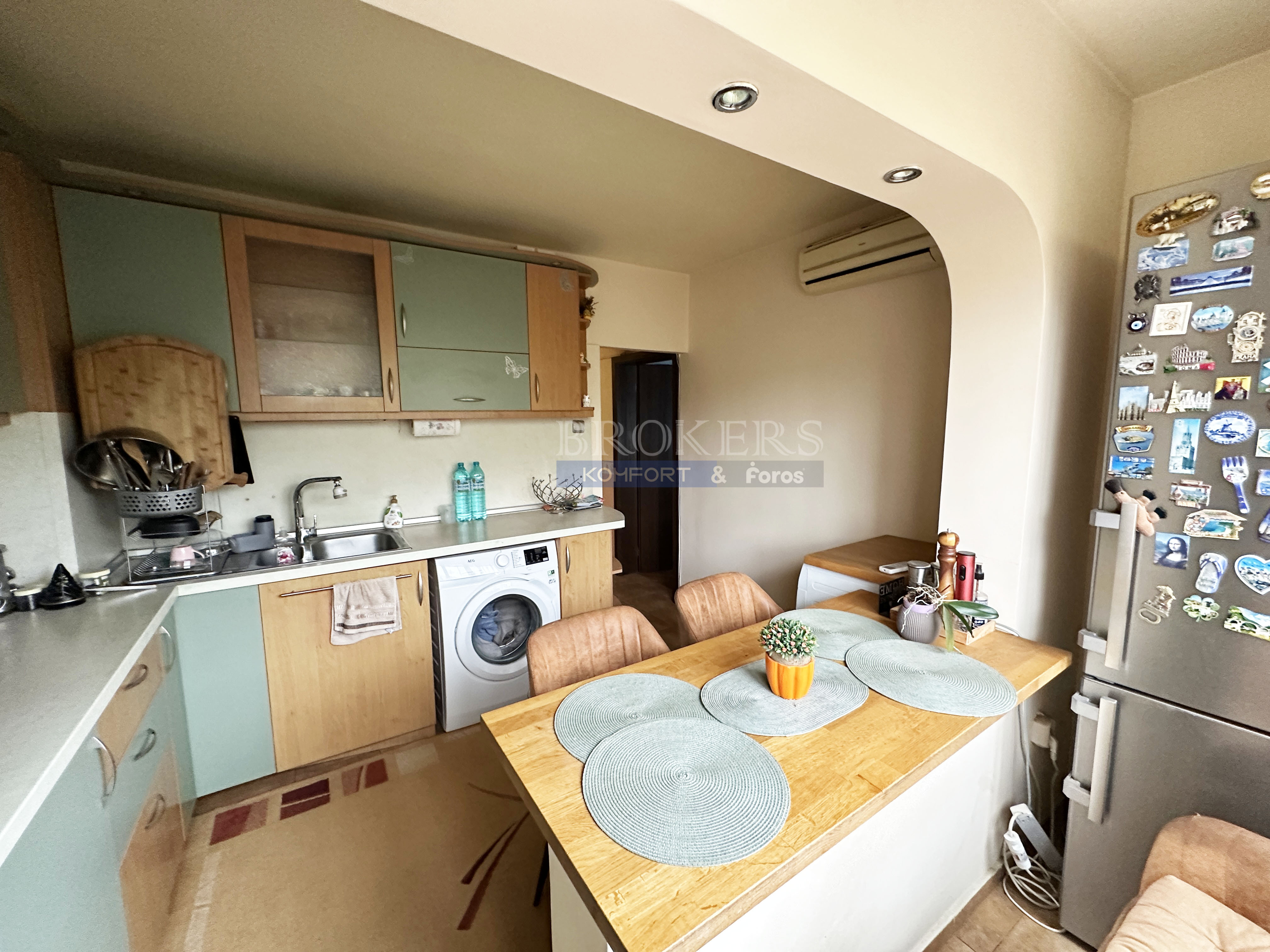 Разпределението е практично: просторна дневна, трапезария с кухненски бокс, една спалня, баня с тоалет, както и две тераси – усвоена към кухнята и остъклена към хола.