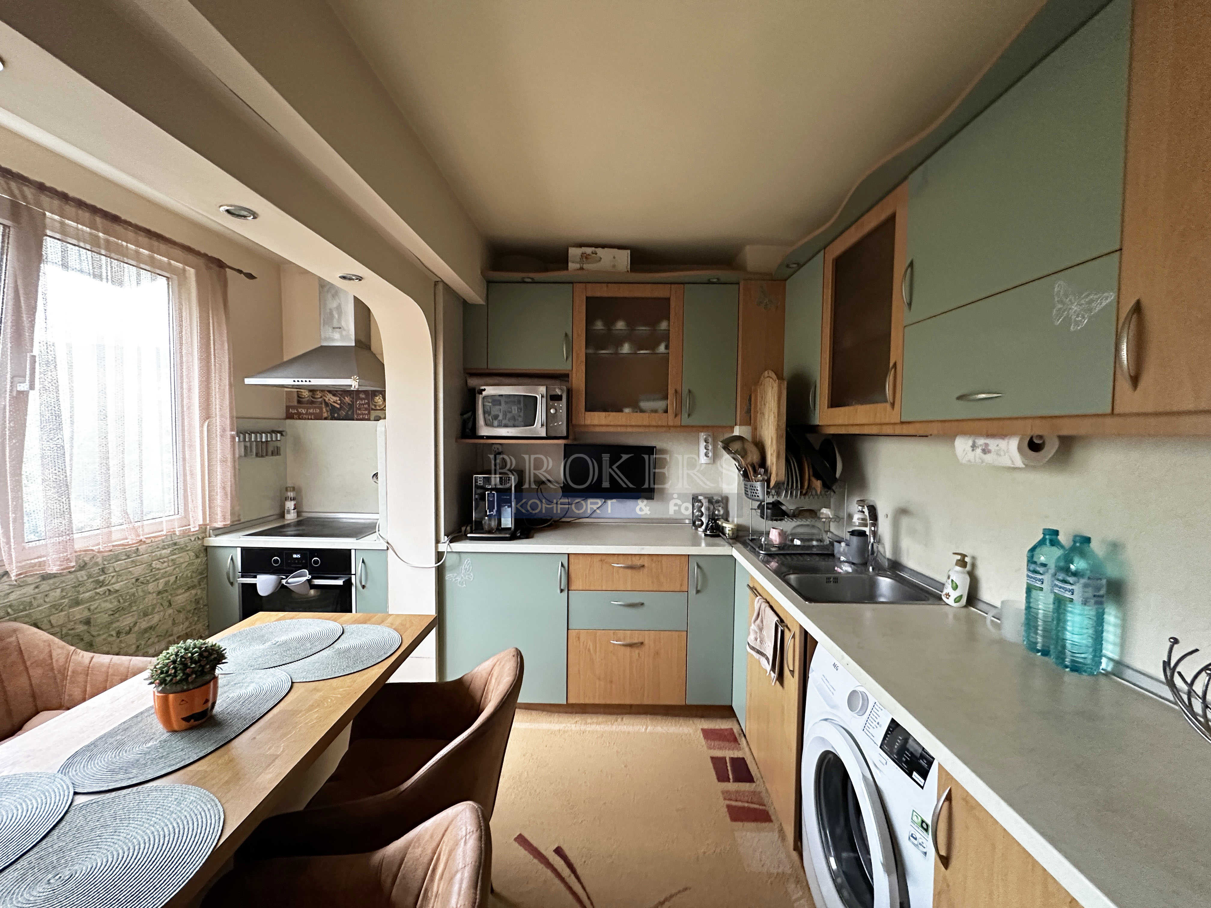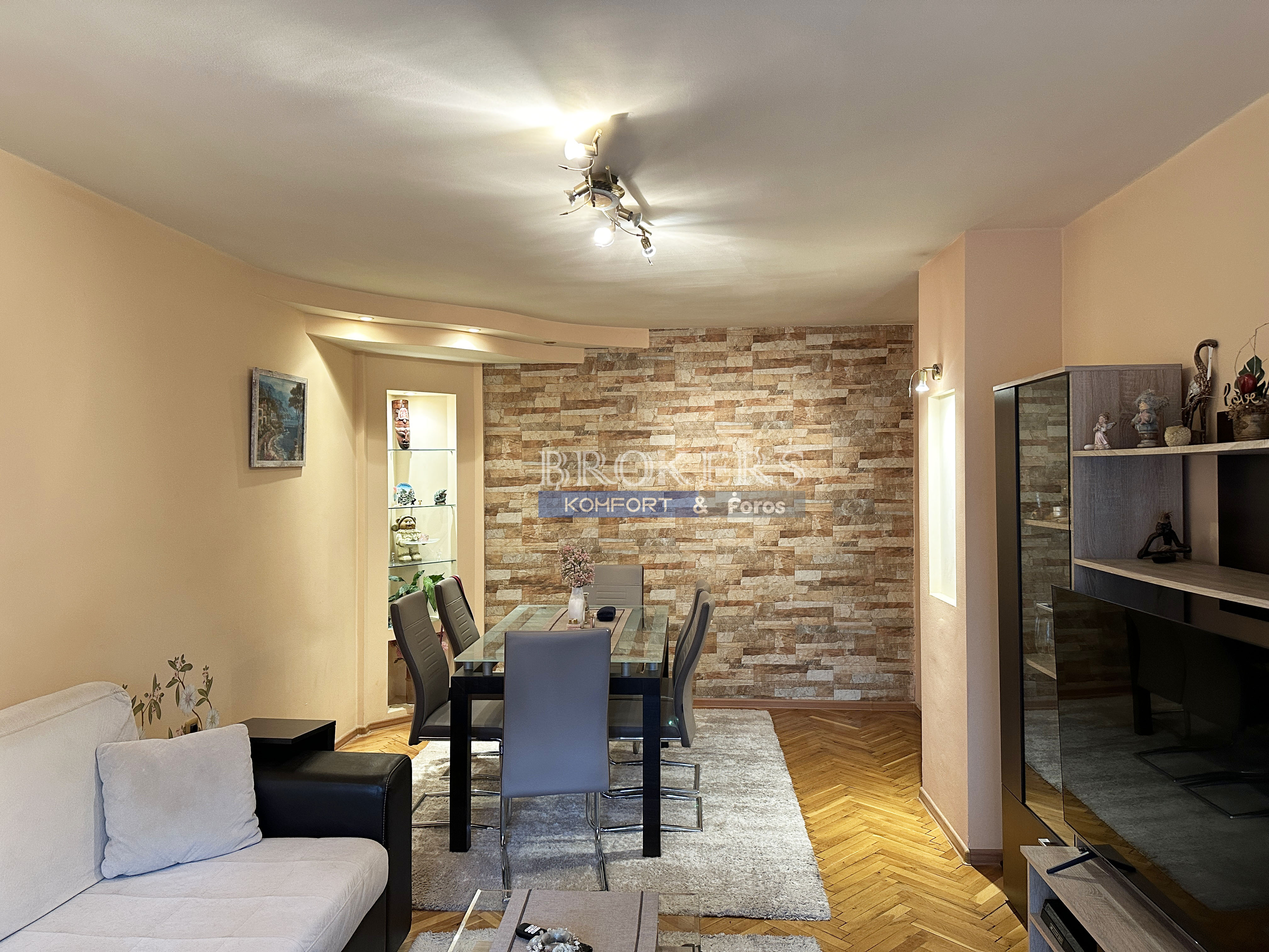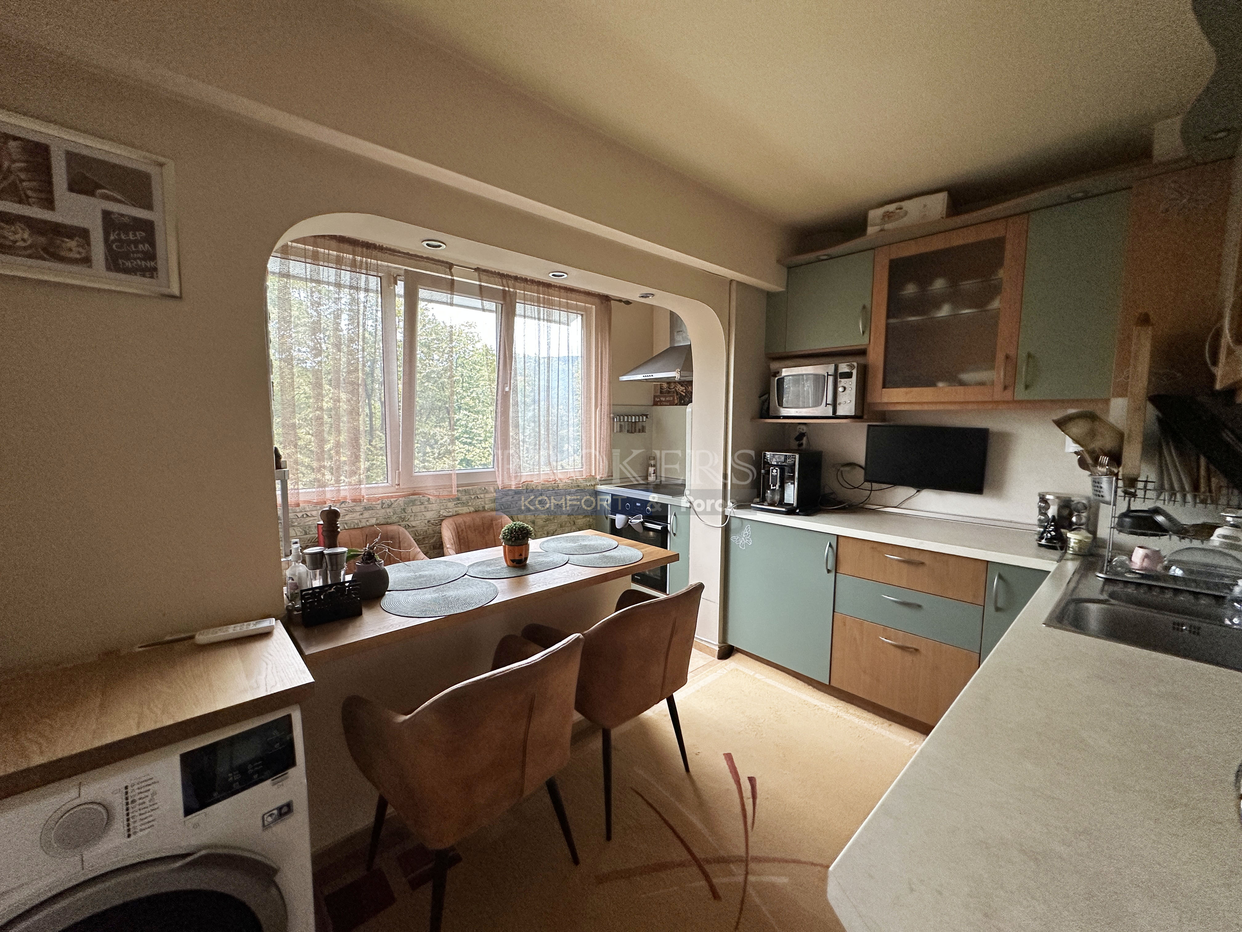 Разпределението е практично: просторна дневна, трапезария с кухненски бокс, една спалня, баня с тоалет, както и две тераси – усвоена към кухнята и остъклена към хола.